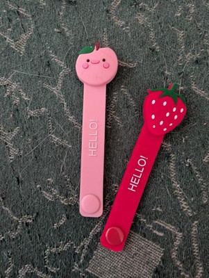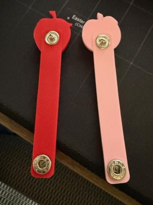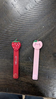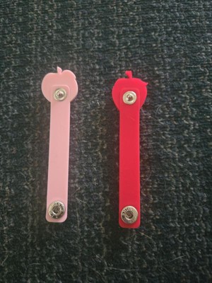 In this package there are two adorable cable wraps. Once is a peach and the other is a strawberry. They have a snap at the bottom to close around a phone or other tech cable. I scored these 4/5 stars because they are not adjustable and the snap doesn't seem very strong. They do the job and are cute, so I would still recommend.