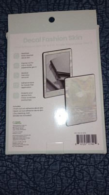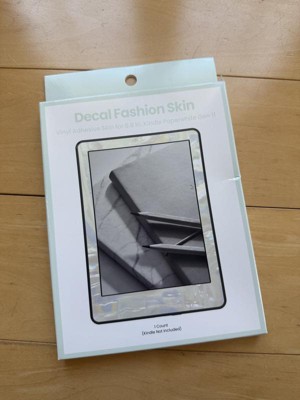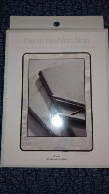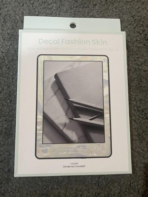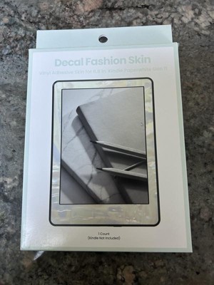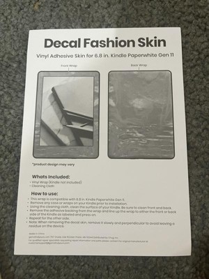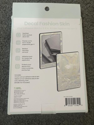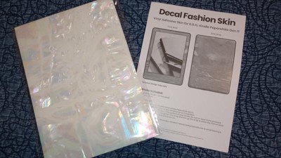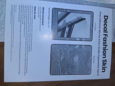 The Kindle decal skin comes in a vinyl adhesive skin for the 6.8 inch paperwhite Gen 11 version. The skin has a pearlized seashell finish. The skin is precise fit to the kindle with a adhesive back. What is included in the kit is a dry cloth, 1 front/back cut out decal skin. Be sure to use the cleaning cloth to completely clean off all areas front to back of the kindle.