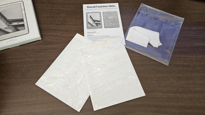Upon opening there was a distinct and overwhelming smell coming off of the vinyl. The adhesive is strong and held up to multiple attempts to line up the skin. It is definitely a wiggle and try your best situations as the proportions are weird (the spacing between the corners is just a touch too short so it you aren't able to line it up right with the edge of the screen like the packing and instructions show. But, once you get it mostly right it looks decent! Fair warning though, if you have a screen protector on and you try to pull it off to adjust it, the vinyl and screen protector will come off