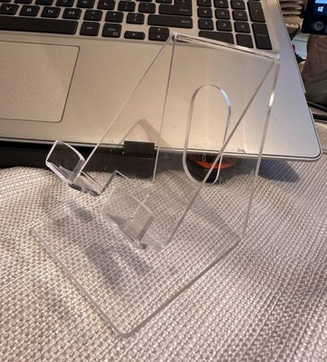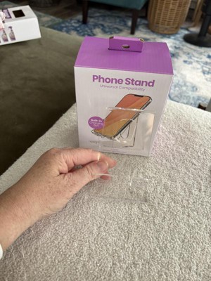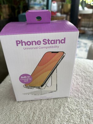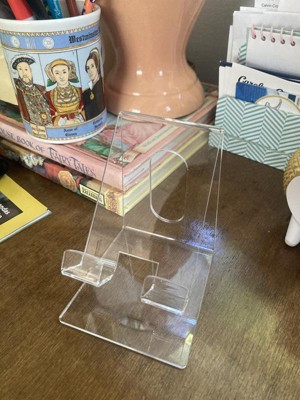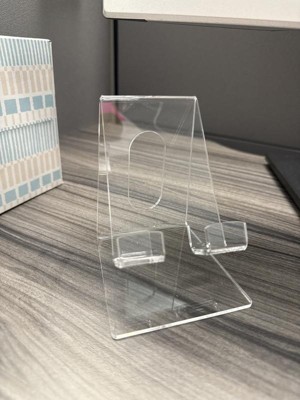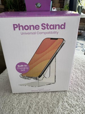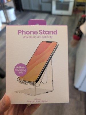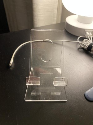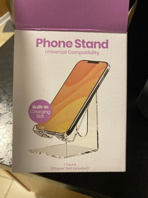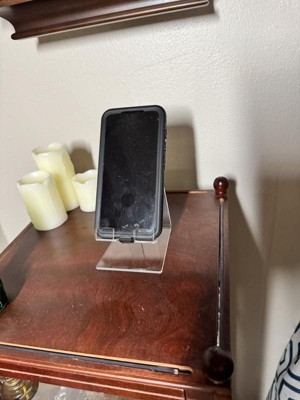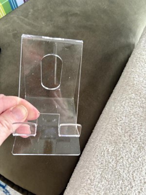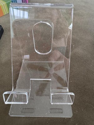 The Clear Acrylic Phone Stand is sturdy and has a built in charging slat. Both our Android and Apple phones were able to sit securely in the stand. It provided a safe place to charge the phones in a pinch.