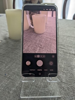 Simple and ready to use phone stand design. I have a Google Pixel pro and it's able to hold this large style phone, with no problems. It's clear so it matches any decor. I can even take it with me while traveling.