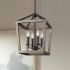 The Gannet collection by Generation Lighting offers a traditional rustic farmhouse look for your home. This four-light foyer pendant light comes in an open steel frame dressed in weathered wood oak and antique forged iron finishes. This hanging light is perfect for entryways, hallways, living rooms, and more.
