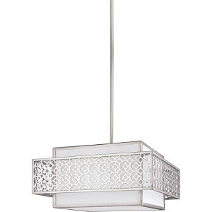 A decorative, dual-layered, geometric motif is stamped out of the steel frame which floats over a white linen shade to create depth and visual interest.
