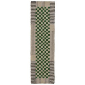 The meticulously designed pattern features a harmonious blend of grey and vibrant green squares, bordered by subtle grey stripes, bringing a contemporary yet timeless aesthetic to any hallway or narrow space. The modern style of this rug complements an array of interiors, effortlessly bridging classic and contemporary decor.
