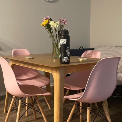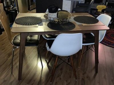 Nice table for 4 with a chair on each side. It is small, perfect for an apartment, but my family of 4 can still sit comfortably. Easy to assemble, did it myself quickly. Love the design with angled legs. That does mean that you have less room as it goes up though. The table top does have an old school vibe that I like but I believe that’s what others have not liked and called a “school cafeteria table” look, LOL! By the time I put my place mats and such you barely see the table top though. But that does mean I have less surface area to clean which is great because I’m not even sure what to use yet for fear of damaging the finish so I’ve just been using Target’s fragrance-free wipes then go over with a paper towel. I’m sure a soapy sponge could work too. I typically use spray cleaners on other surfaces but don’t want to on this. The table slides around with every movement on hardwood floors so maybe get some felt or anti-slip pads. I plan to try the rug under table look which may help with that. If I don’t like that look, the pads.