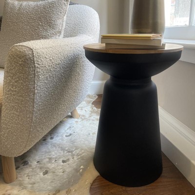 - Black metal drum accent table with flat wooden tabletop adds functional decor to any seating space
