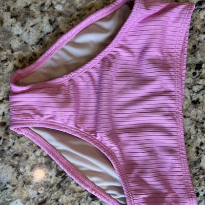 [This review was collected as part of a promotion.] These high rise pink bikini bottoms have great fuller coverage on the backside as well. This is a more modest style than others out these days and I appreciate that. There is a ribbed pattern texture to the suit which allows it to lay really nicely when worn. The fabric is soft and comfortable on the skin. This runs true to size at a medium for my kiddo who normally wears a size 8. I received an incentive to write this review.
