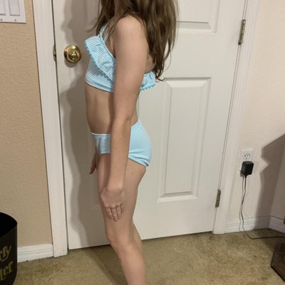 [This review was collected as part of a promotion.] Love the look of this seersucker bikini set. It is absolutely adorable on with the stripes and ruffles. My daughter is eight and the suit fit perfectly. She did say that the bottoms were a little on the tight side, I wish we could get a size up in the bottoms, but keep the same size top. The turquoise color on it was absolutely beautiful and would be perfect for the summertime. I received an incentive to write this review.