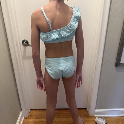 Add playful style to your child’s swim wardrobe with this Striped Bikini Set from Cat & Jack™. Crafted from a soft fabric blend with stretch for flexible comfort, this two-piece swimwear set features aqua blue stripes on a white background. The swim top has an asymmetrical neckline, adjustable left strap and ruffled frill on the right. The pull-on bottom offers a hipster silhouette with medium coverage. Both pieces provide UPF 50+ protection for sunny-day fun.