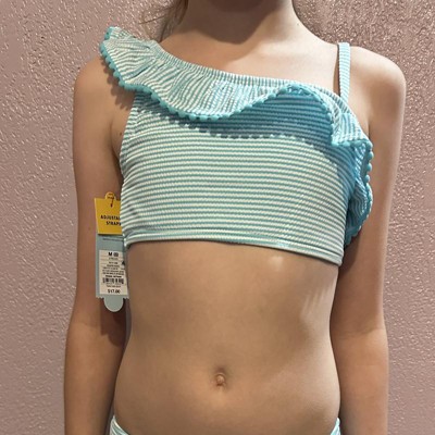 Add playful style to your child’s swim wardrobe with this Striped Bikini Set from Cat & Jack™. Crafted from a soft fabric blend with stretch for flexible comfort, this two-piece swimwear set features aqua blue stripes on a white background. The swim top has an asymmetrical neckline, adjustable left strap and ruffled frill on the right. The pull-on bottom offers a hipster silhouette with medium coverage. Both pieces provide UPF 50+ protection for sunny-day fun.