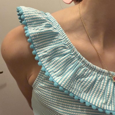 [This review was collected as part of a promotion.] Love the look of this seersucker bikini set. It is absolutely adorable on with the stripes and ruffles. My daughter is eight and the suit fit perfectly. She did say that the bottoms were a little on the tight side, I wish we could get a size up in the bottoms, but keep the same size top. The turquoise color on it was absolutely beautiful and would be perfect for the summertime. I received an incentive to write this review.
