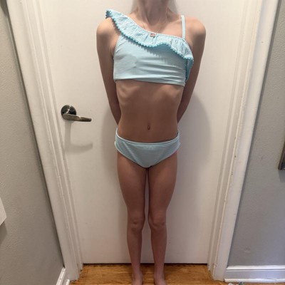 [This review was collected as part of a promotion.] My nine year old daughter is 52 inches tall, weighs approximately 58 lbs, and tried on the size medium 8 in this striped bikini set from Cat & Jack. It honestly fits her perfectly, we would definitely say it fits true to size. The bikini bottoms provide full coverage and the design of the top is so cute. The color is a very pretty blue that we both love! Great high quality swimsuit for your kiddo! I received an incentive to write this review.