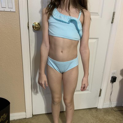 Add playful style to your child’s swim wardrobe with this Striped Bikini Set from Cat & Jack™. Crafted from a soft fabric blend with stretch for flexible comfort, this two-piece swimwear set features aqua blue stripes on a white background. The swim top has an asymmetrical neckline, adjustable left strap and ruffled frill on the right. The pull-on bottom offers a hipster silhouette with medium coverage. Both pieces provide UPF 50+ protection for sunny-day fun.