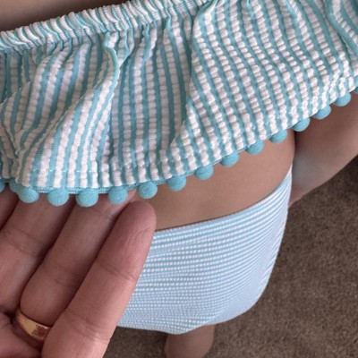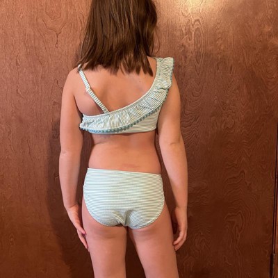 [This review was collected as part of a promotion.] Love the look of this seersucker bikini set. It is absolutely adorable on with the stripes and ruffles. My daughter is eight and the suit fit perfectly. She did say that the bottoms were a little on the tight side, I wish we could get a size up in the bottoms, but keep the same size top. The turquoise color on it was absolutely beautiful and would be perfect for the summertime. I received an incentive to write this review.