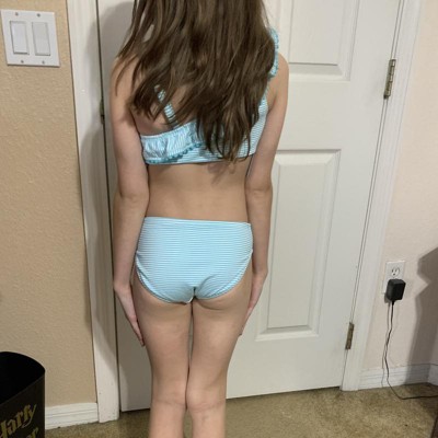 [This review was collected as part of a promotion.] My nine year old daughter is 52 inches tall, weighs approximately 58 lbs, and tried on the size medium 8 in this striped bikini set from Cat & Jack. It honestly fits her perfectly, we would definitely say it fits true to size. The bikini bottoms provide full coverage and the design of the top is so cute. The color is a very pretty blue that we both love! Great high quality swimsuit for your kiddo! I received an incentive to write this review.