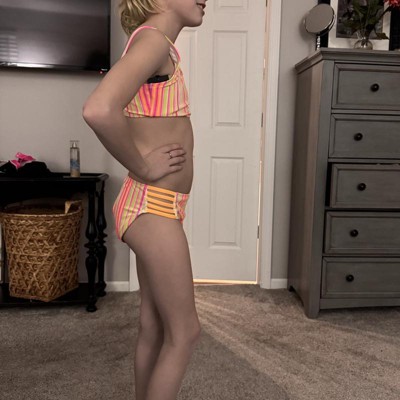 [This review was collected as part of a promotion.] My daughter tried this 2 piece bathing suit in a size medium (8) which is a good size for her in this brand and other similar brands. It fit her as expected and looks very cute on. The material is nice, bright, and comfortable. I appreciate that the bottoms have generous coverage. The quality seems on par with what I’ve come to expect from Art Class and the price is great. I received an incentive to write this review.