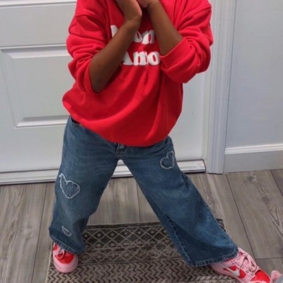 • A: These are wide-leg jeans featuring distressed heart motifs for a trendy look.