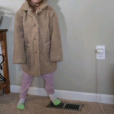 [This review was collected as part of a promotion.] I absolutely love this fluffy coat. I love how it almost is like a sweater however it is also like a jacket. Definitely not worthy for Midwestern snow but great for fall or a chilly day. It is not lined inside. It is simply fleece on both ends. However, the buttons are super cute and easily able to do undo. My daughter is 11 and 4’9” tall for reference and this is a size large, her typical size or a size 10, and it fits very well.