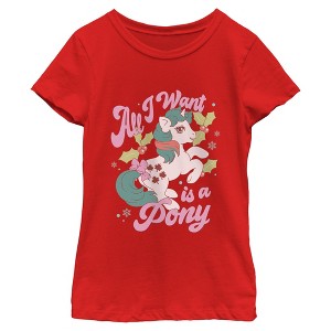 You won't be able to rein in your excitement for these officially licensed My Little Pony styles! Whether you're a fan of the original Hasbro toy from the 1980s or you just recently discovered the newest ponies, everyone can agree that it's time to pony up with some fun new apparel! This Girls' My Little Pony All I Want Is Graphic T-Shirt features the brave and cute Gusty surrounded by mistletoes and snowflakes, and the phrase "All I Want Is A Pony" in bold pink lettering, perfect for Christmas!