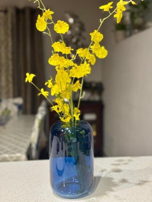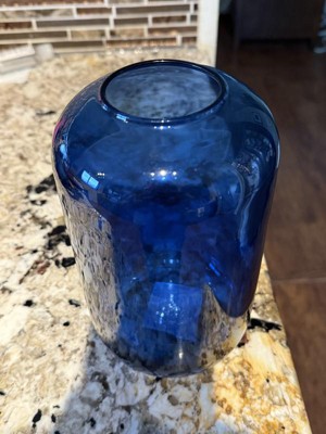 This is a nice but basic blue vase. The hole at the top is small which won't allow you to put a large amount of flowers into it. The vase does seem sturdy enough where you won't have to worry about it tipping over if you put a sizable amount of flowers in it. It is pretty much blue throughout except for the bottom where it clears up.