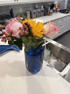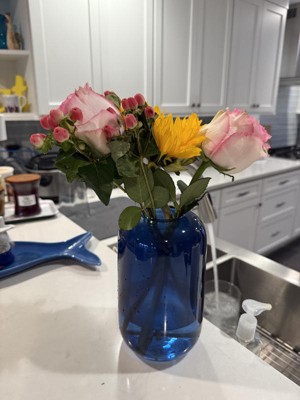 This vase has a beautiful, deep blue color. It is very pretty and can be displayed while not in use. The opening is on the smaller side, so it won’t hold a large bouquet of flowers. But it’s perfect for a bunch of tulips, or other flowers, that come in bunches of ten.