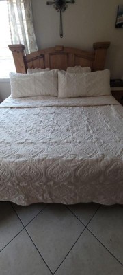 [This review was collected as part of a promotion.] This beautiful cover is perfect color.for my bedroom its a light beige color. The material is not too thick which i love my husband and i get too hot under too many blankets this is perfect weight. Quality is nice and the design is beautiful with a medallion print on both sides. The fit is perfect the king size corners hit just right at the floor. It came with 2 shams and the blanket. I definetely will reccomend this.