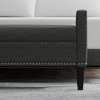 An inviting modern bench, this upholstered storage ottoman strikes a contemporary silhouette with two-track arms and four solid wood square tapered legs. While a foam-filled cushion and arms provide added comfort and support. Just lift up the seat for hidden and functional storage - perfect to stash hats, gloves in an entryway or sheets and blankets in a bedroom. Available in three widths: 42", 46", and 52" with and without nickel plated nailhead trim.