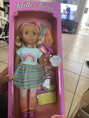 Be colorful and bedazzle with Brie! This 14-inch Glitter Girls hairdresser doll has bright brown eyes, long eyelashes, and long, silky blonde and purple hair that's fun to brush and style. And she's poseable! Her arms and legs bend and rotate to easily change outfits and style her friends' hair when they enter the GG Salon! Use the 4 sectioning clips to separate your doll's hair and get creative with the scissors and comb. Then use the blow dryer to reveal the WOW moment! Glitter Girls dolls each come with one complete outfit. Brie is ready to shine in her a rainbow top with a matching skirt, gradient leggings, and bright purple shoes. And her stylist apron keeps the accessory tools always in reach! Her outfit also has easy-open closures to quickly put on and remove, so Brie can dazzle in her outfits just as she does with her hair!