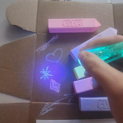My daughter was super excited about this glow chalk. She was disappointed as it doesn’t seem to really work and if it does work the small blue light they give with it doesn’t really do much. She even tried it in the dark just to say it doesn’t really work. She still enjoys it and loves anything that is chalk.