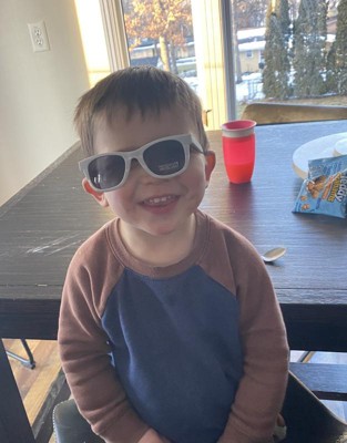 These are nice and sturdy baby/toddler/preschooler glasses. They’re a little bit big, but still fitted, for my 7 month old and they fit my 3 year old well. He ran around for 10 minutes straight while wearing them and they didn’t budge. I really like that they block UVA and UVB.