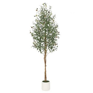 - Lifelike olive tree features silk leaves, multiple trunks, and a full yet airy look. Planted in a white planter with green moss and cement for stability and realism.