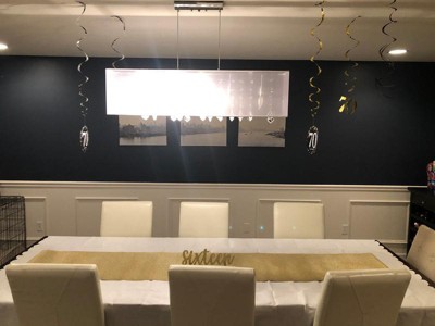 A: The gold glitter design complements any party theme, adding a festive touch to tables.