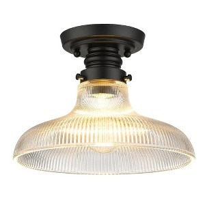 Clary's vintage-inspired design is great in eclectic, traditional, and transitional interiors. The clear, optic glass is paired with a modern Matte Black finish, allowing the light to work well in classic and more modern environments. Paying homage to the fun decor of old-school diners and food joints, the timeless look of the wide Ribbed Optic Glass shade takes center stage. The linear texture of the attractive flared glass draws the eye while gently diffusing light. Clary is damp-rated. With a low-profile design, it is perfect for hallways and bathrooms.