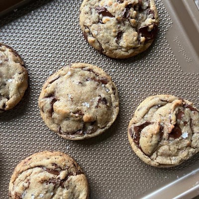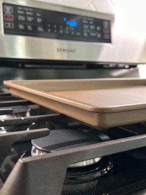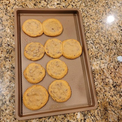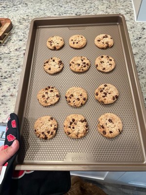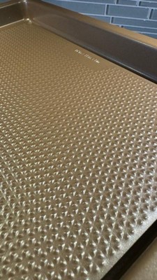 [This review was collected as part of a promotion.] As a former pastry chef, I can be a little particular about the tools I use in my home kitchen. This pan did not disappoint, and I'm actually quite pleased with it across several benchmarks. Right out of the packaging it felt weighty and solid, which I appreciated. The bronze color is also a nice touch. I also enjoyed that the size is slightly bigger than conventional baking sheets. I thought cookies would be the perfect thing to make to see what this pan had to offer and it was a good call. I was able to see by the bottoms of the cookies that the pan excels in the even dispersal of heat, which is vital. I did use parchment for the cookies but later made a one-pan meal of chicken and vegetables which needed no cooking spray not to stick. Though substantial, the baking sheet isn't unwieldy and still fits in my dishwasher so I'm happy. From someone who has worked with many of the best kitchen tools on the market, I give this pan a very enthusiastic 5 stars.