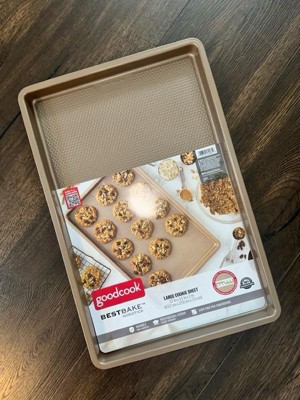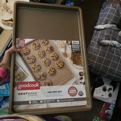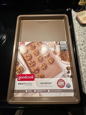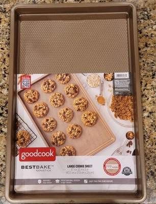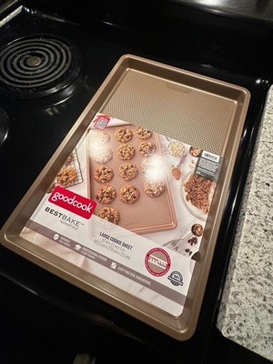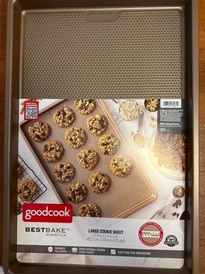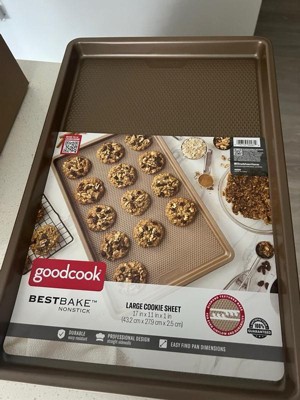 Bring quality bakeware to your home kitchen with the GoodCook BestBake Textured Large Cookie Sheet. This premium baking sheet ensures a perfect bake every time for larger batches of your favorite recipes, from cookies and other desserts to sheet pan dinners. The textured, diamond-pattern surface finish promotes proper airflow for even heating without hotspots and offers additional stability and strength. Scratch-resistant nonstick coating, provides excellent release while also making clean up quick and easy. This nonstick baking sheet measures 17" x 11" x 1" and is made with carbon steel and bronze finish to resist warping and offer high quality baking for years to come.