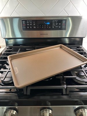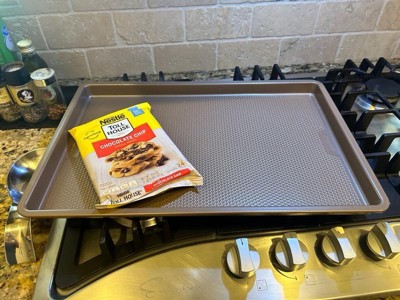 [This review was collected as part of a promotion.] Super impressed with the quality of this baking sheet!! I baked chicken wings with it in the oven and they were cooked perfectly. The baking sheet has ridges that helps with air flow and I can tell it works by how well it cooked the wings. It’s a perfect size for making cookies or really anything you would need a baking sheet for. A great baking sheet!! Highly recommend!