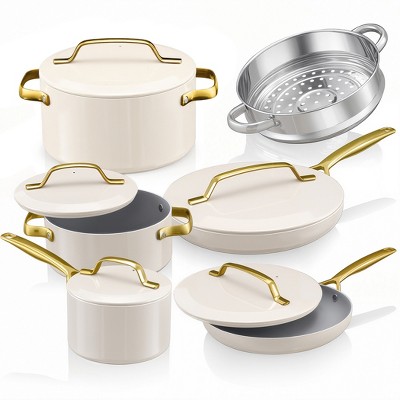 - GOTHAM STEEL NATURAL COLLECTION: Healthier cooking is easy with this nonstick ceramic cookware set. Pots and pans are designed to be 2x more durable, dishwasher safe, and oven safe up to 500ûF. Gold stay-cool handles allow you to go from stovetop to oven. But this set doesnÕt just cook good, they look good too, with a modern cream color that adds an elevated aesthetic to your kitchen.