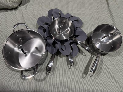 [This review was collected as part of a promotion.] This is a great starter set and it comes with the felt dividers which is a nice touch and great for storage. They are stainless steel so easy to clean, and the glass lids each fit more than one pot. They feel heavy and durable, and they are polished so no food sticking. There is no plastic parts so you can even put them in the oven!
