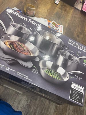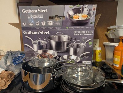 [This review was collected as part of a promotion.] The Gotham Stainless steel 10 piece set looks good. Could be challenging for a rookie to cook food unless you know how to properly do it. But these are great for people who know how to cook well. Do not ruin these by overcooking/having temp too high excessively over time! Came a little scratched but barely noticeable. To maintain, keep these clean and don’t over cook and burn the bottom. There is a lot of versatility with the 10 different options that come with this set. Assembly is easy, take out of the box, find proper tops, and get to cooking. Looks nice!