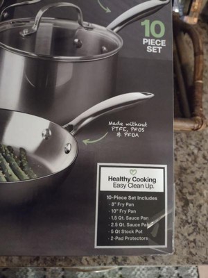 Includes: 8" Frying Pan, 10" frying pan, 1.5 Quart Saucepan With Lid, 2.5 Quart Saucepan With Lid, 5 Quart Stockpot With Lid, Cookware Protectors, Slotted Spoon, Slotted Turner, Solid Turner, Spoon, Ladle