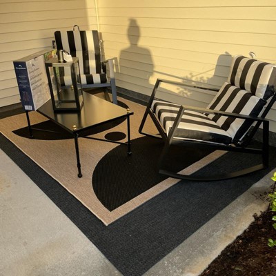 Bring some functional and versatile style to your patio, deck or porch with this Grace Half-Circle Indoor/Outdoor Rug in Tan and Black from Threshold™. This rectangular polypropylene rug features a bold geometric pattern in a tan-and-black color scheme that will complement whatever décor or color palette is already in place. With flat pile height for easy cleaning and woven construction for lasting use, this half-circle design indoor/outdoor rug is the perfect way to bring a modern, functional addition to your space.