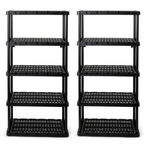 Declutter your home, office, or garage space with the Knect-A-Shelf Heavy-Duty 4 Shelf Interlocking Storage Unit by Gracious Living. This durable but lightweight shelving unit can instantly help organize tools in your garage, files in your office, or anything that you need to be stored. Constructed of durable plastic, this 4-shelf unit can hold 150 pounds per shelf without bending or wearing down the shelves for a total of 600 pounds per unit. If 4 shelves aren't enough, the state-of-the-art interlocking system allows you to connect your shelf to others (sold separately), creating your very own custom shelving unit. Designed with a black finish, this shelving unit will seamlessly blend into any room you set it up in. The Knect-A-Shelf assembles quickly and easily, without the need for tools to ensure a stress-free setup. At a little over 4.5 feet tall and 3 feet wide, this shelving unit is ideal for storing whatever you need in your garage, basement, utility room, laundry room, or anywhere storage is required. Get organized with the Gracious Living Knect-A-Shelf Heavy-Duty 4 Shelf Interlocking Storage Unit.