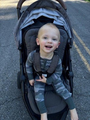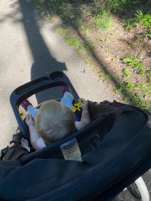 This jogging stroller has made adventuring so easy! We live near a disc golf course and the stroller does great navigating the varied terrain. The canopy provides great sunshade - when we use it with the car seat that clicks in, baby is completely covered. It is a bit heavy and clunky but not so much so that it’s a dealbreaker. A great way to keep my kids safe and contained on family adventures!
