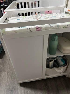 - INCLUDES STORAGE DRAWER AND CHANGING TABLE: Includes full-size drawer with 2 separate compartments, allowing you to conveniently store and organize your nursery items and essentials; Attached changing table includes 3 enclosed storage drawers, 2 open shelves, water-resistant changing pad, and safety strap