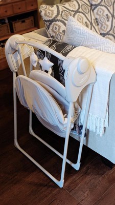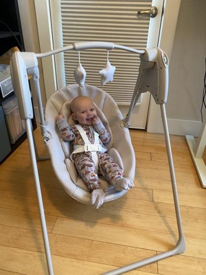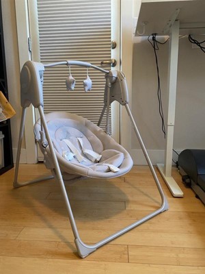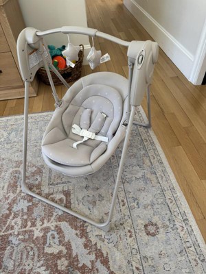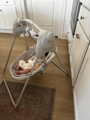 [This review was collected as part of a promotion.] As a mom of a 6-week-old, I was so excited to receive this swing as part of the Stellar Product Testing panel. The swing took me about 10 minutes to assemble by myself and did not require any tools to put together. It is battery-operated, which gives tons of flexibility for use. Instead of being heavy and requiring a wall outlet, the Graco Slim Spaces Swing is easy to move from room to room or take with me when we visit the grandparents. It is small enough to fit in my kitchen to keep the baby content while I cook dinner, which has been a huge win. The Slim Spaces swing is surprisingly quiet, with just a slight clicking sound when in use. It swings forward and backward when the battery is activated, but the arm joints have flexibility to manually move the swing seat side to side, if desired. This does make the seat a little wobbly when loading baby in, but I found I can use one arm to stabilize the seat and the other to lower the baby in to be buckled. My favorite feature is that it easily folds in half when not in use, making it simple to store, move from room to room, or even pack in the trunk. I have been really pleased with this swing!