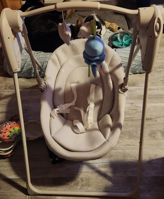 [This review was collected as part of a promotion.] This is a very simple, compact swing perfect for when you don’t want something that takes up loads of space. My little Velcro baby will swing in it contendedly allowing me to put him down for a bit. I do wish there was a power supply to plug into the wall and not just batteries as batteries can get expensive and if they run out I’m out of luck. We are using this swing with our fourth baby. We appreciate very much that it is small when opened and can be folded when not in use to make space for the other kids. The swing speeds offer a great variety of options for when baby needs more or less stimulation. I also like that I can add in more toys to the toy bar for more interesting visual stimuli as the toys on it are very neutral. It would be better if they had more contrast or brighter colors or even reflecting mirrors or something. They are also a little high for the visual field of the baby. I love the fabric and neutral colors. It fits right into our home. Thanks to the Stellar Product Testing Panel for providing me with this swing to use with my baby!
