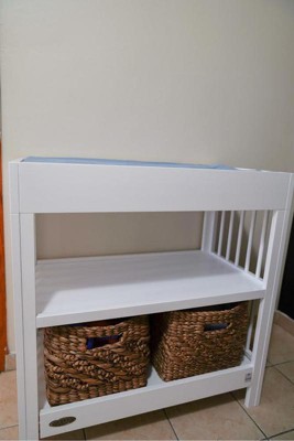 Perfect changing table. It fits a standard changing pad and two shelves for plenty of storage. It economical and also is nice to look at since you’ll be living with it for a couple years. Somehow, it’s not easy to find all of the above features in a changing table wothout paying way too much. Here you have it all!