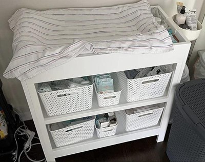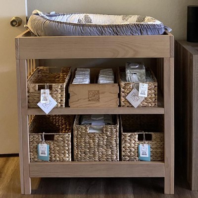 We love this changing table. Lots of room for storage. Very sturdy. And it’s the perfect height. Highly recommend.
