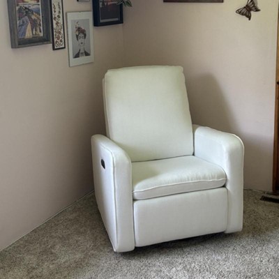 I love this chair! I was a little nervous to buy it because it had very few reviews, but after a few weeks of use I have to say it was worth the gamble. It is firm but comfortable, the fabric is soft, and the recline is super smooth. The ivory color is actually a pretty bright white like the pictures. It was very easy to assemble. The arms are a good height for nursing and the seat is wide enough for me to sit in cross legged. My only negatives are that it does creak straight out of the box. It’s a lower pitch creak not a annoying high squeak and it comes and goes depending on how you rotate the chair and how much you are rocking, but it is a little disappointing. I need to try to oil the mechanisms and see if it helps. The other thing to note is that there are blue lights in the button/charge port area and they are pretty bright. I wish there was the option to turn them off, but I just drape a blanket over the arm of the chair to dim them and keep the nursery dark while my baby sleeps. Overall I’m pleased with my purchase and would recommend this chair to a friend!