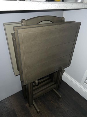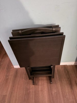 [This review was collected as part of a promotion.] Lining Rustic5 pieceTrayTable Set is very sturdy. When all 4 trays are in the storage rack it’s so heavy I can’t even move it. Three trays are really beautiful and hold up very well. Great to eat out of because they don’t tip easy. The storage rack very simple to assemble. I recommend putting the rack where you want before putting all the tables in it. Very heavy.